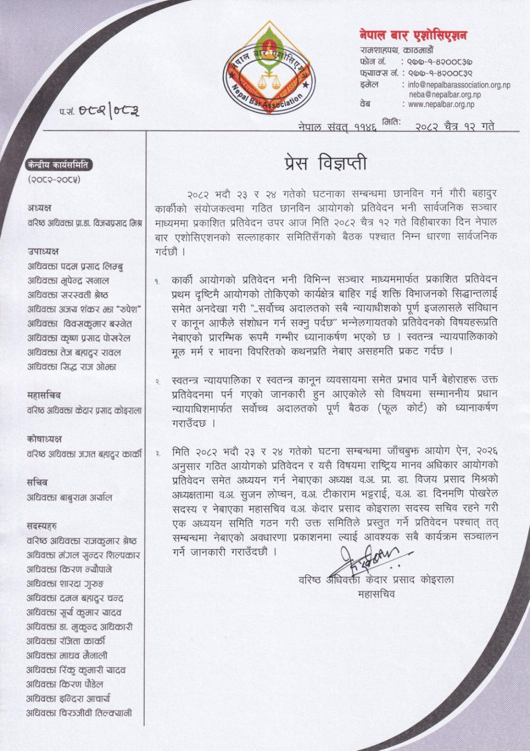 समितिमा वरिष्ठ अधिवक्ता सुजन लोप्चन, टीकाराम भट्टराई र डा। दिनमणि पोखरेल सदस्य तथा महासचिव वरिष्ठ अधिवक्ता केदारप्रसाद कोइराला सदस्य सचिव रहेका छन्।