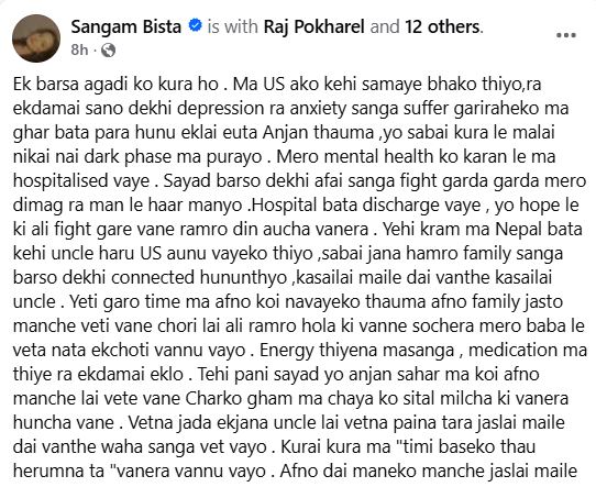अमेरिकामा बसोबास गर्ने एक नेपाली युवतीलाई विश्वास गरेका “परिचित” व्यक्तिले बलात्कार गरेको घटना सार्वजनिक भएको छ। वर्षौंदेखि मानसिक स्वास्थ्यका समस्या र एक्लोपनसँग संघर्ष गर्दै आएकी ती युवती अस्पताल भर्ना पनि भएकी थिइन्।