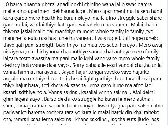 युवतीले आफ्ना अनुभूति सार्वजनिक गर्दै भनेकी छन्, “जति आशा र शक्ति बाँकी थियो, त्यो सबै हरायो। मेरो आवाज निस्किएन, चिच्याउन चाहन्थेँ, तर परिवारलाई केही भए भन्ने डरले केही भन्न सकिनँ। यस घटनाले मेरो आत्मा, शरीर, मन र दिमाग सबैलाई प्रभावित पारेको छ।”