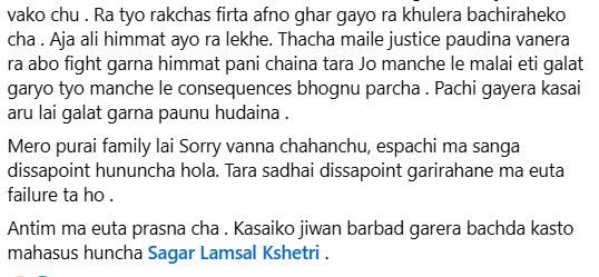 घटनापछि पीडितले आफ्नो परिवार र समाजप्रति क्षमायाचना गरेकी छन् र दोषी व्यक्तिले न्यायको सामना गर्नुपर्नेमा जोड दिएकी छन्। उनले थपिन्, “पछिल्लो समयमा न्याय पाउने आशा छैन, तर यसले अरूलाई पनि गलत गर्ने बाटो नखोलोस्।”
