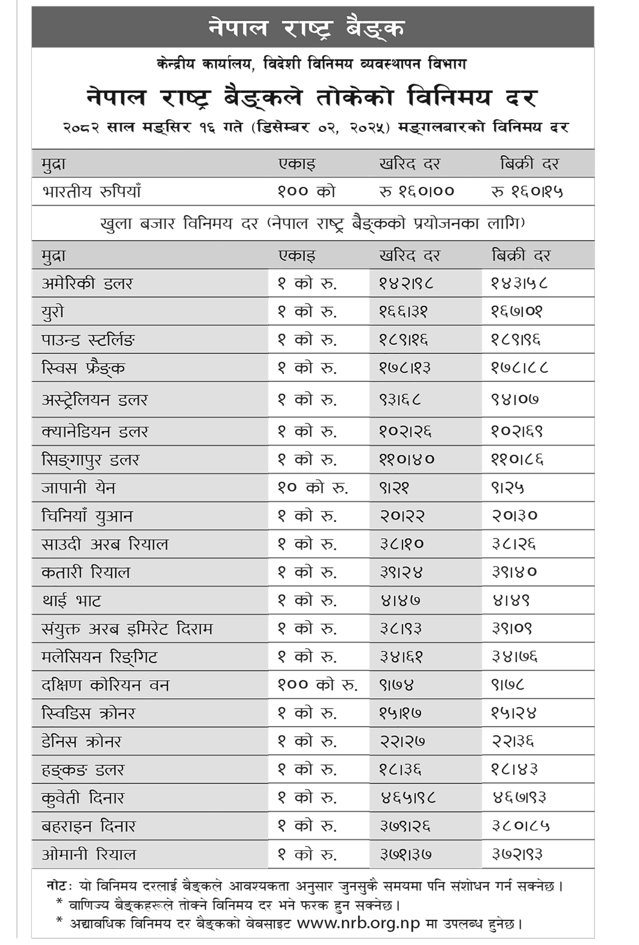 जापानी येन १० को खरिददर नौ रुपैयाँ २१ पैसा र बिक्रीदर नौ रुपैयाँ २५ पैसा तथा चिनियाँ युआन एकको खरिददर २० रुपैयाँ २२ पैसा र बिक्रीदर २० रुपैयाँ ३० पैसा कायम भएको छ ।