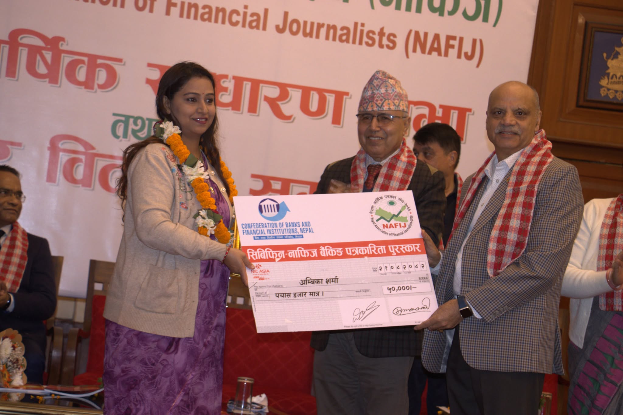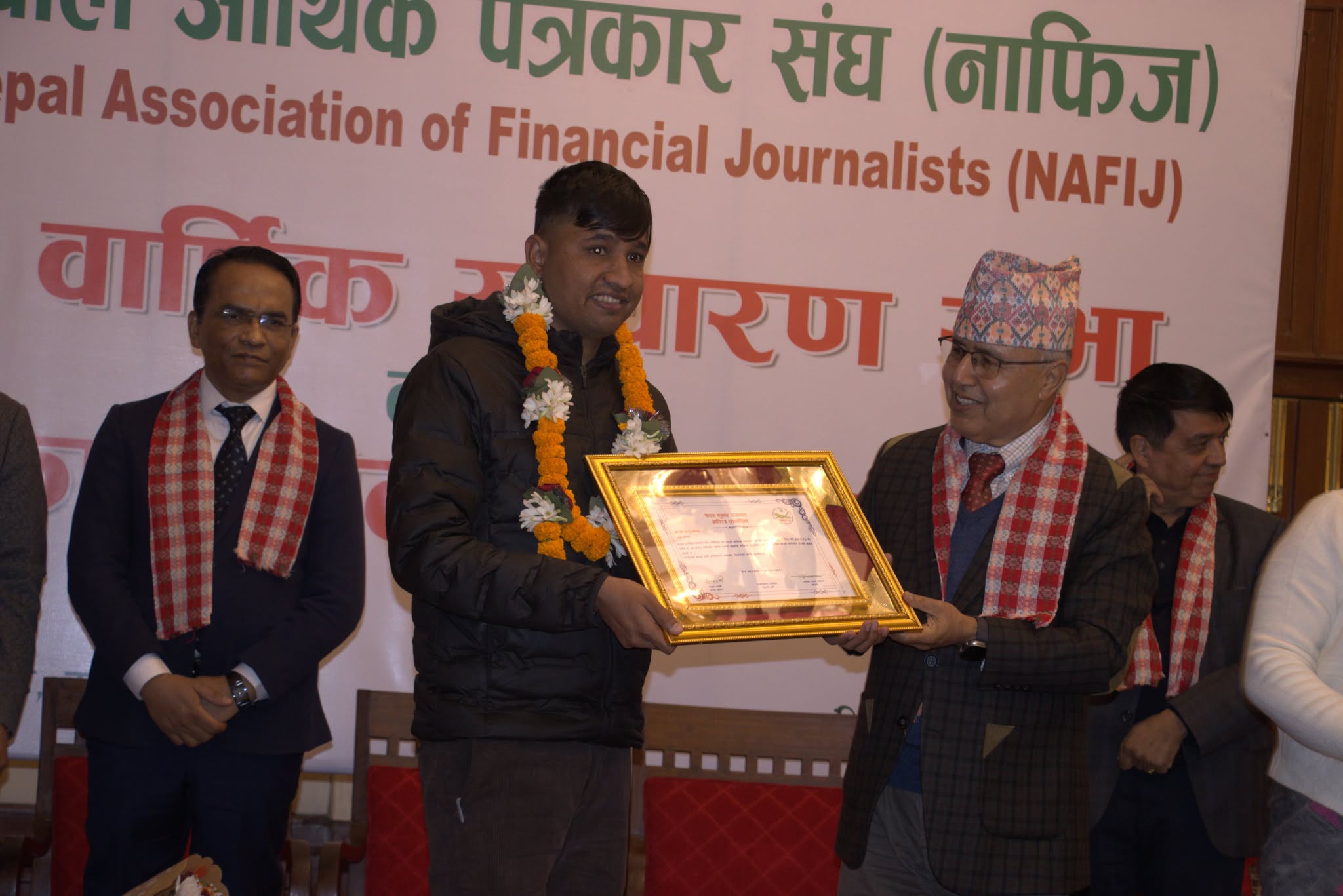 काठमाडौं । क्रियाशील आर्थिक पत्रकारहरुको साझा संस्था नेपाल आर्थिक पत्रकार संघ (नाफिज)ले तीन जना आर्थिक पत्रकारहरुलाई पुरस्कृत गरेको छ । आइतबार काठमाडौंमा आयोजना गरिएको नाफिजको १६ औं वार्षिक साधारण सभामा फरक फरक विधामा सम्मान गरेको हो ।
