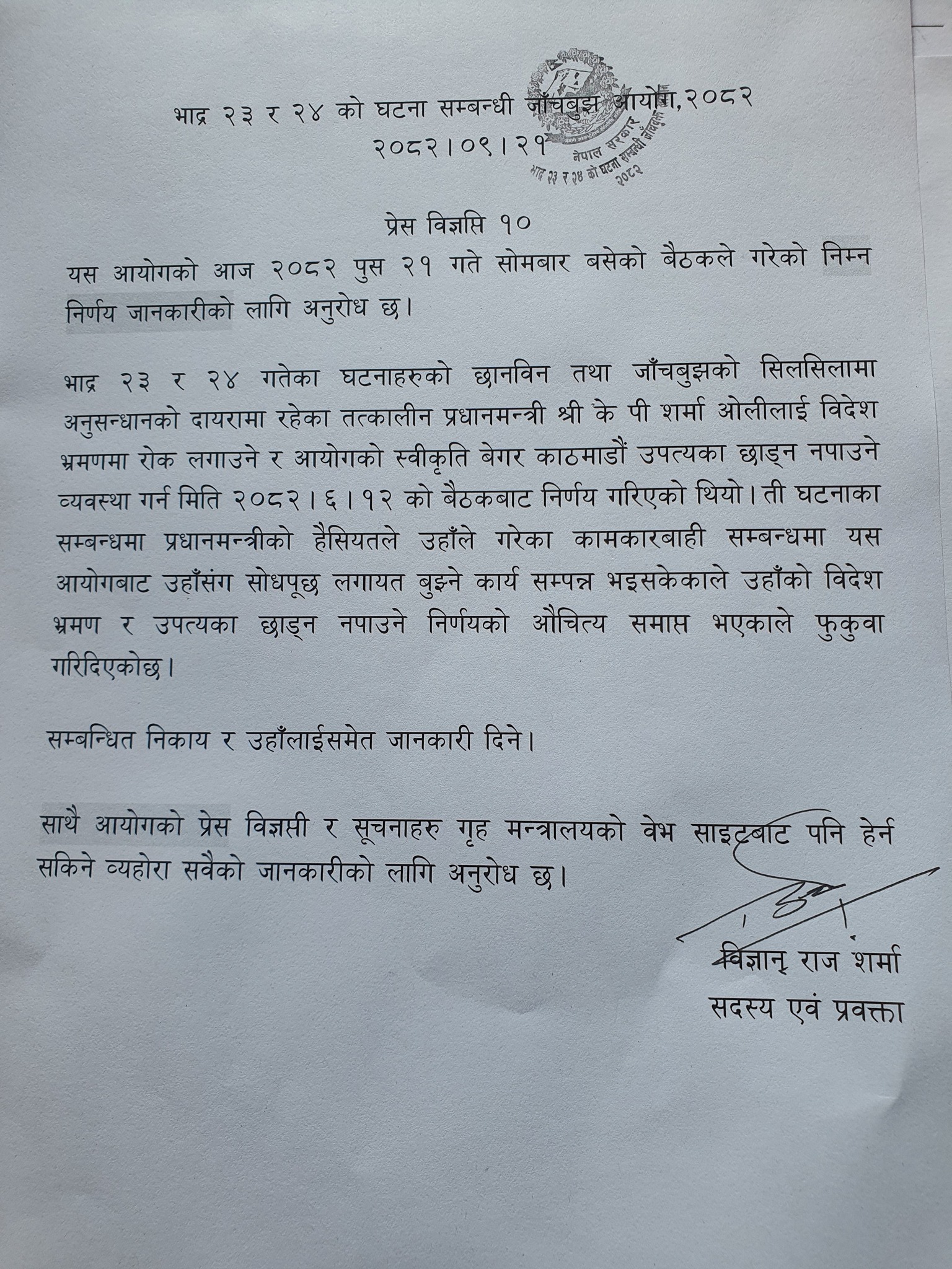 जाँचबुझ आयोगले सोमबार प्रेस विज्ञप्ति जारी गरेर स्थानहदको औचित्य सकिएको जनाएको छ । आयोगका प्रवक्ता शर्माले जारी गरेको विज्ञप्तिमा भनिएको छ, ‘घटनाका सम्बन्धमा प्रधानमन्त्रीको हैसियतले उहाँले गरेका कामकारबाही सम्बन्धमा यस आयोगबाट उहाँसँग सोधपुछ लगायतका बुझ्ने कार्य सम्पन्न भइसकेकाले उहाँको विदेश भ्रमण र उपत्यका छाड्न नपाइने निर्णयको समाप्त भएकाले फुकुवा गरिदिएको छ ।’