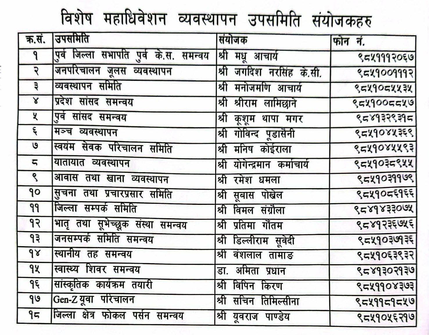 काठमार्डौ । नेपाली कांग्रेसका विशेष महाधिवशेन पक्षधरले पुस २७ र २८ गते काठमाडौँमा विशेष महाधिवेशन गर्ने घोषणा गरेका छन् । महाधिवेशन पक्षधरले गठन गरेको सूचना प्रसार प्रसार उपसमितिले बुधबार काठमाडौँमा पत्रकार सम्मेलन गर्दै पुस २७ र २८ गते भृकुटी मण्डपमा विशेष महाधिवेशन गर्ने घोषणा गरेको हो । महाधिवेशन पक्षधररूको तर्फबाट सुवास पोखरेलले पत्रकार सम्मेलन गरी घोषणा गरेका हुन् । महाधिवेशन पक्षधरले उपसमिति गठन गरेको छ । उनीहरूले महाधिवेशन व्यवस्थापनका लागि १८ वटा उपसमिति बनाउँदै संयोजक तोकेका हुन् । व्यवस्थापन, जनपरिचालन, मञ्च व्यवस्थापन, आवास तथा खाना व्यवस्थापन, जेनजी युवा परिचालन लगायतका विभिन्न १८ वटा उपसमिति गठन गरिएको हो ।