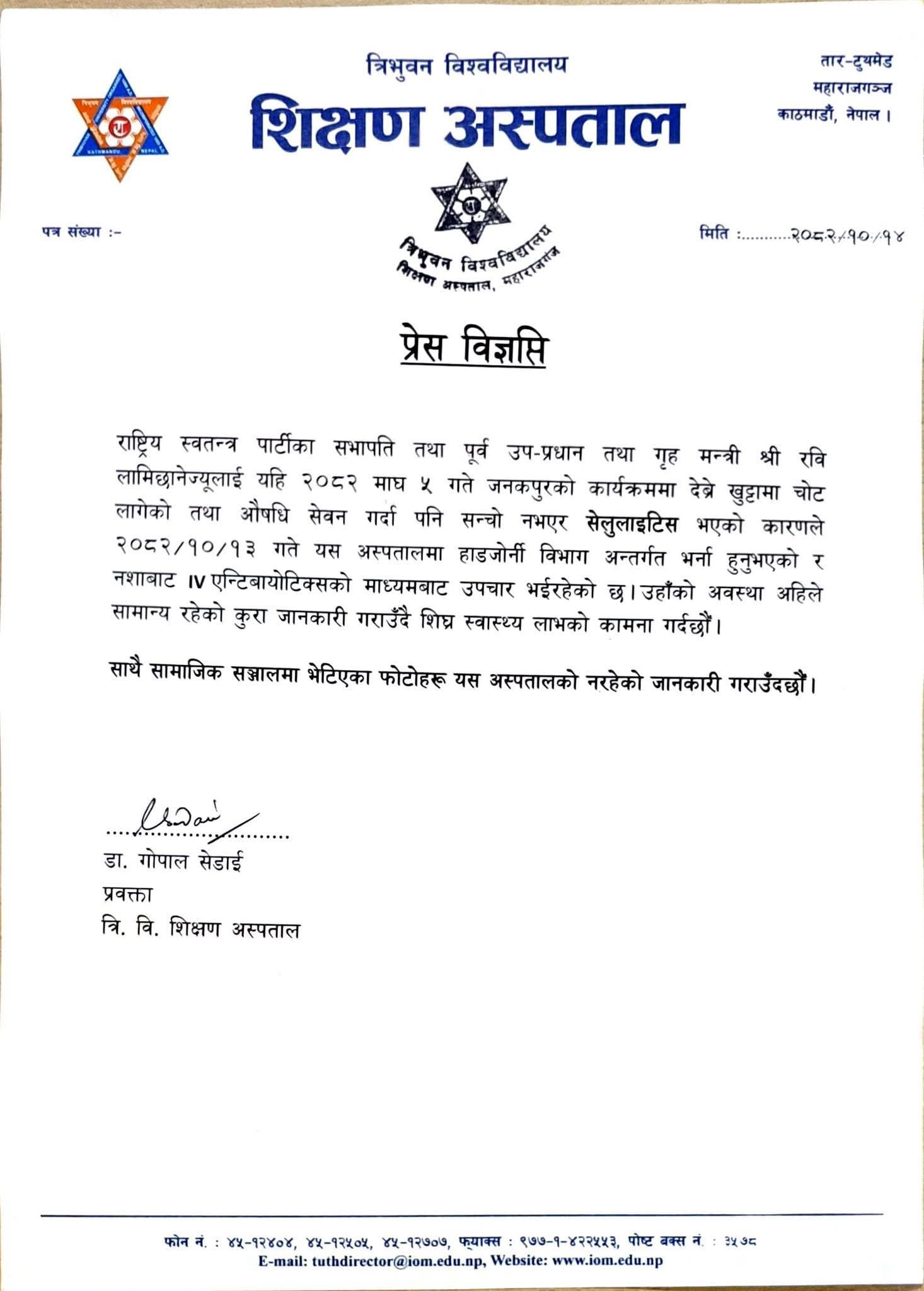 यसबीच सामाजिक सञ्जालमा रविको खुट्टा पूरै प्लास्टर गरिएको तस्बिरहरू भाइरल भए पनि ती तस्बिर एआई–निर्मित भएको अस्पतालले स्पष्ट पारेको छ ।