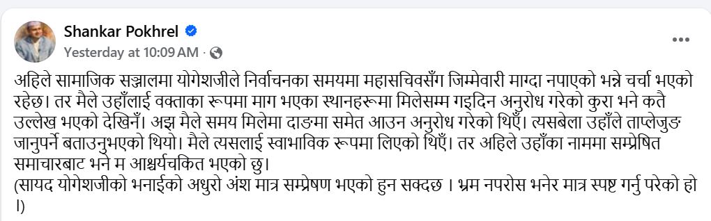 योगेशको सार्वजनिक अभिव्यक्तिसँगै महासचिव शंकर पोखरेलले सामाजिक संजाल फेसबुकमा जवाफ फकाएछन् । पोखरेलले लखेका छन्–उपमहासचिव भट्टराईलाई वक्ताका रूपमा माग भएका स्थानहरूमा मिलेसम्म गइदिन अनुरोध गरेको दावी गरेका छन् । महासचिव पोखरेलले समय मिलेमा आफ्नो क्षेत्र दाङमा समेत आएर सहयोग गर्न आवहान गरेको दावी गरेका छन् । योगेशको धारणाबाट असन्तुष्ट महासचिव पोखरेलले उपमहासचिव भट्टराईलाई फेसबुकमा लेखेर जवाफ दिनुले नेताहरुबीच सम्बन्ध बिग्रिएको सहजै अनुमान गर्न सकिन्छ ।
