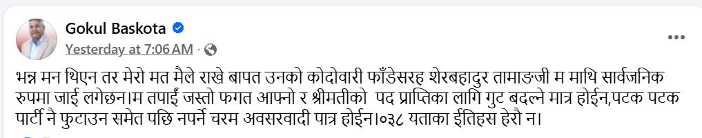 एमालेभित्र नेतृत्व तहले नैतिकता देखाउनुपर्ने भन्दै बढीरहेको आलोचना त्यतिमा मात्रै सीमित छैन । एमाले नेता गोकुल बास्कोटाले सामाजिक संजाल फेसबुकमा आफूले ५ वर्ष अघि सच्चिन सुझाव दिएको बताएका छन् ।