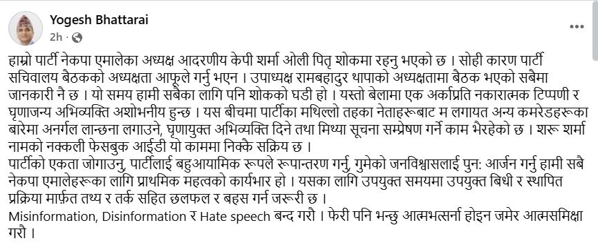सामाजिक सञ्जालमा भट्टराईले भनेका छन्, पार्टीका मथिल्लो तहका नेताहरूबाट मलगायत अन्य कमरेडहरूका बारेमा अनर्गल लान्छना लगाउने, घृणायुक्त अभिव्यक्ति दिने तथा मिथ्या सूचना सम्प्रेषण गर्ने काम भैरहेको छ । शरू शर्मा नामको नक्कली फेसबुक आईडी यो काममा निक्कै सक्रिय छ ।’